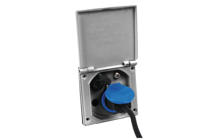 Multifunktions-Außensteckdose für 12/230V - Antenne/TV Sat. Farbe silbergrau. Maße 100 x 100 mm.